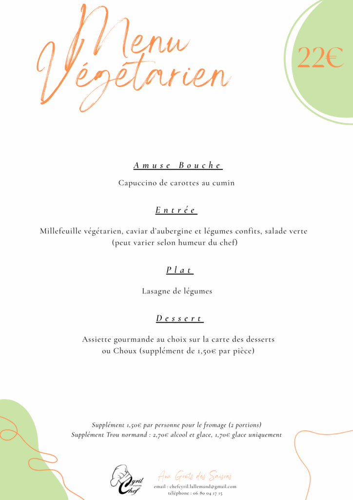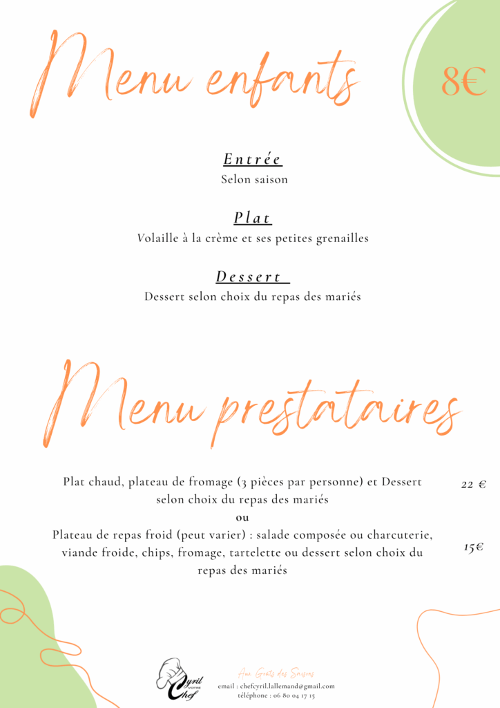 Nous proposons également un menu végétarien, un menu enfant et un menu prestataires. Vous trouverez des photos de nos assiettes en bas de cette page.